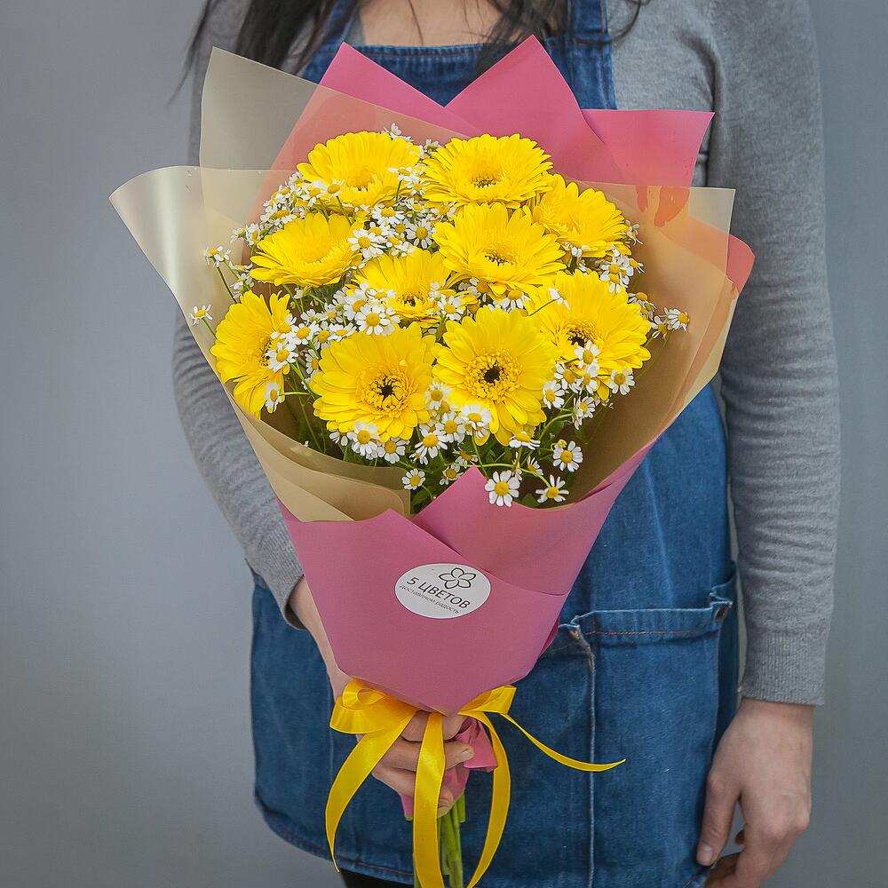 Букет из 11 желтых гербер и 15 ромашек кустовых в Пыть-Яхе